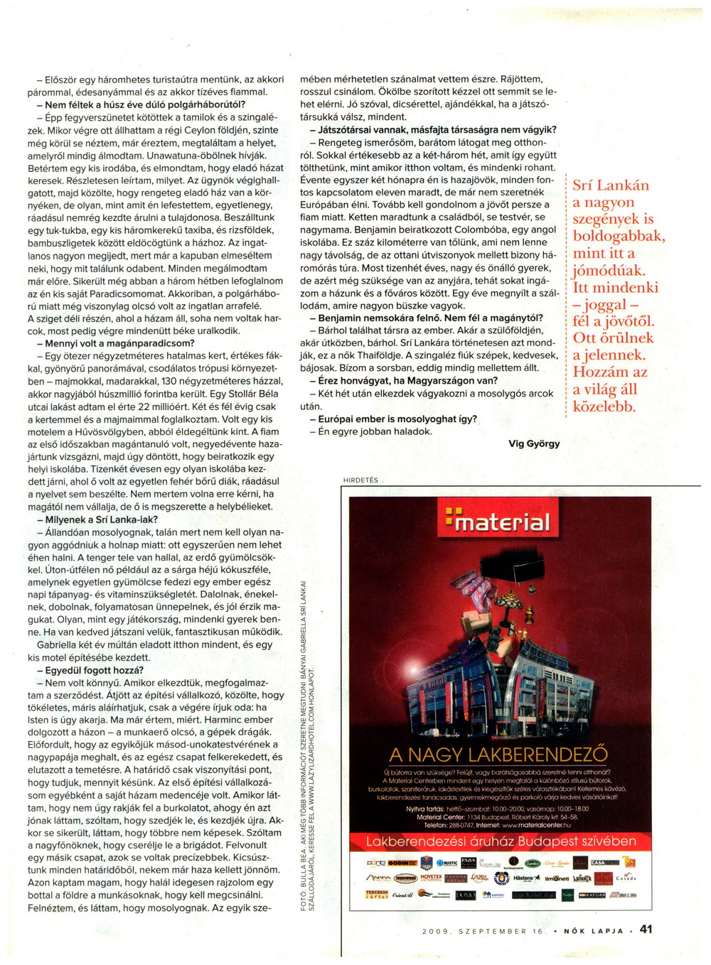 - Rengeteg ismerősöm, barátom látogat meg otthonról. Sokkal értékesebb az a két-három hét, amit így együtt tölthetünk, mint amikor itthon voltam, és mindenki rohant. Évente egyszer két hónapra én is hazajövök. Minden fontos kapcsolatom elven maradt, de már nem szeretnék Európában élni. Tovább kell gondolnom a jövőt persze a fiam miatt. Ketten maradtunk a családból, se testvér, se nagymama. Benjamin beiratkozott Colombóba, egy angol iskolába. Ez száz kilométerre van tőlünk, ami nem lenne nagy távolság, de az ottani útviszonyok mellett bizony háromórás túra. Most tizenhétéves, nagy és önálló gyerek, de azért még szüksége van az anyjára, tehát sokat ingázom a házunk és a főváros között. Egy éve megnyílt a szállodám, amire nagyon büszke vagyok.
