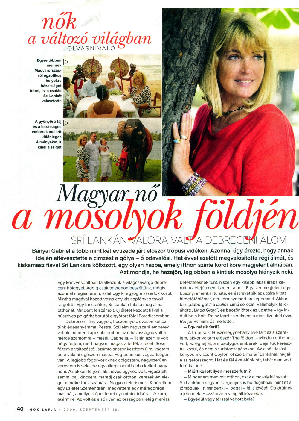 Bányai_Gabriella több mint két évtizede járt először trópusi vidéken. Azonnal úgy érezte, hogy annak idején eltévesztette a címzést a gólya – ő odavalósi. Hat évvel ezelőtt megvalósította régi álmát, és kiskamasz fiával Srí Lankára költözött, egy olyan házba, amely itthon szinte kőről kőre megjelent álmában. Azt mondja, ha hazajön, legjobban a kintiek mosolya hiányzik neki.